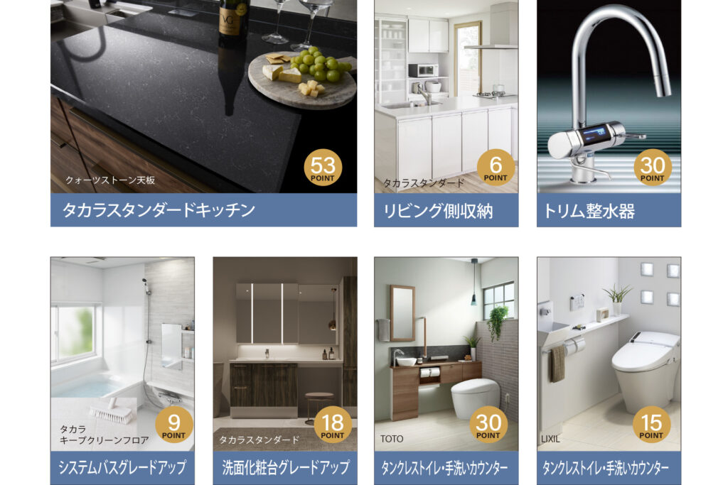 家は建てて終わりではなく、30年、50年と住み続けるものです。 今回のポイントメニュー には、「高耐久外壁(30ポイント)」「システムバス(9ポイント)」、耐久性の高い「水回りコーティング床材(9ポイント)」など、住み始めた後の維持費を抑えるための項目が充実しています。将来の家計を守る視点が、メニュー構成に反映されているのです。