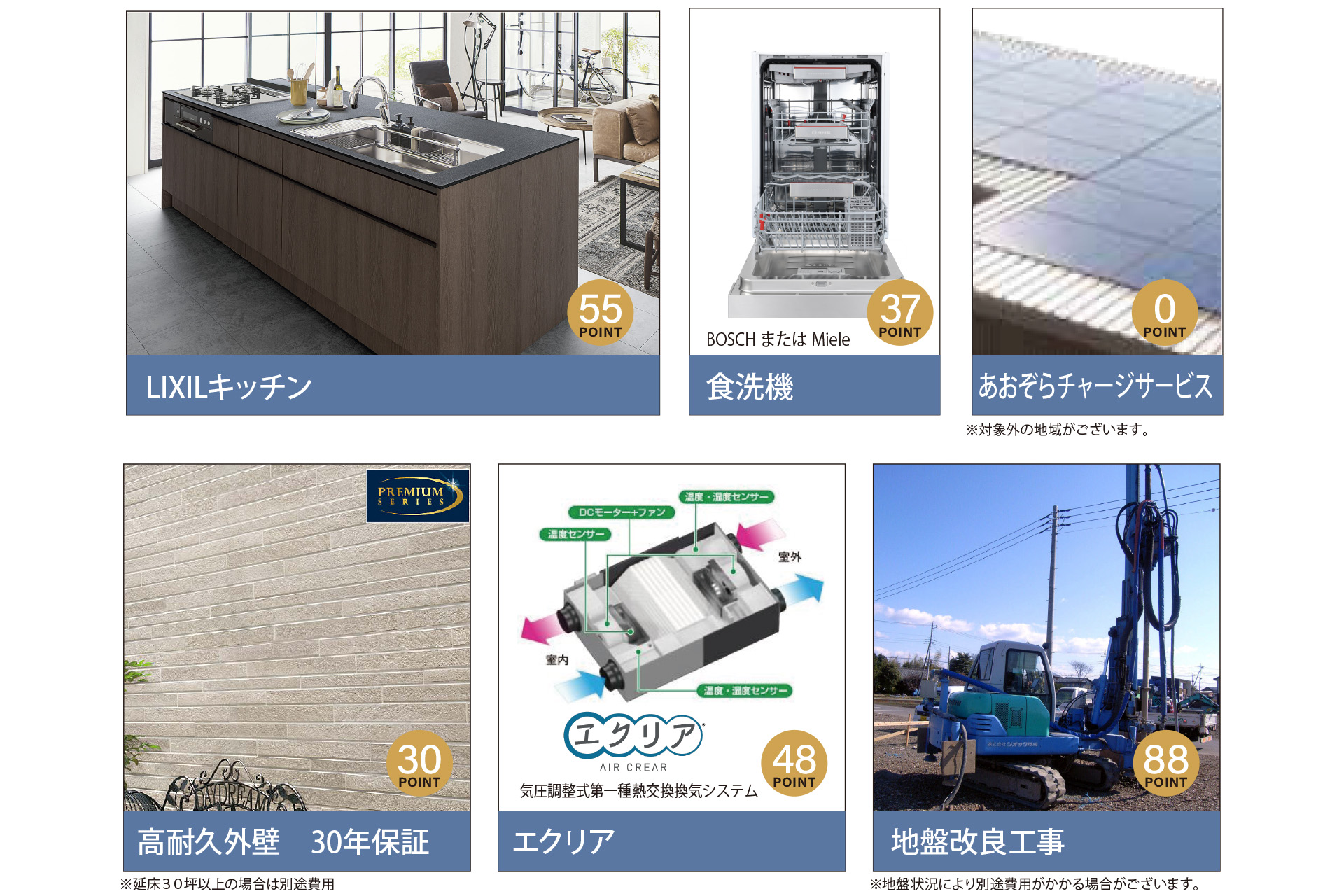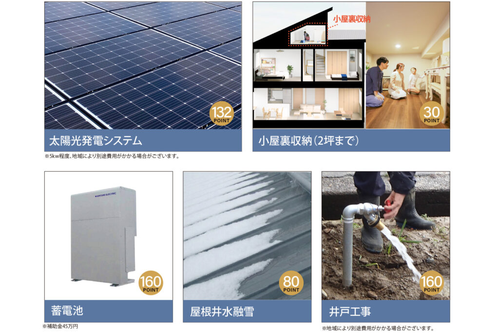 - 合計:162ポイント ※わずか2ポイント(2万円分)の差額で、将来の光熱費を大幅に抑え、かつ収納力の高い住まいが実現します。