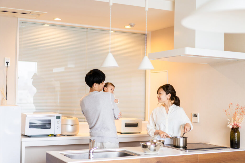 この画像のように、視界が開けたキッチン。 この間取りのおかげで、慌ただしい日々の中でも「家事をしながら育児をこなすことがスムーズになり、ストレスが大きく軽減されました」と、奥様もその効果を日々実感されています。