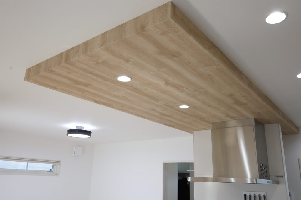 ご主人様の希望で採用されたのが、「折り下げ天井」と「廊下の木目調天井」です。 玄関に入り、リビングへと続く扉(透明なガラス戸)から見たときに、天井の壁紙が統一されていることで空間に深みと広がり、そして美しい統一感が生まれています。