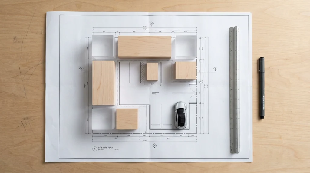 ゾーニングとは、敷地全体を俯瞰し、駐車場、アプローチ、庭、そして建物をどこに配置するかを決める「目的別の位置決め」です。