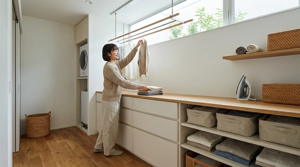 - 洗濯動線の確立: 「外干し」か「室内干し」かを明確にし、洗う→干す→畳む→しまう、の一連の動きが最小限で済む動線を確保します。