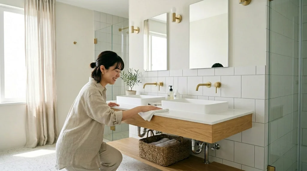 掃除のしやすさは「素材と形状の選び方」で劇的に変わります。洗面カウンターとボウルに継ぎ目がない「ボウル一体型」や、カウンターの下にボウルが潜り込んでいる「アンダーカウンター式」を選べば、水跳ねや汚れもサッとひと拭きで綺麗になります。また、水栓が壁面から出ているタイプを選べば、水栓の根元に水垢が溜まるのを防ぐことができます。