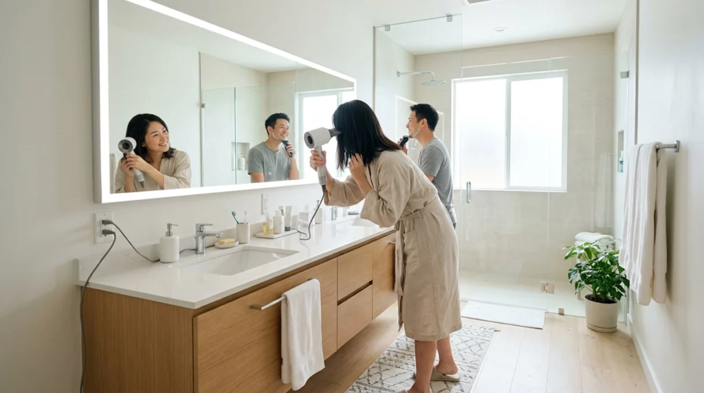 ・コンセント計画:2人並んで使うということは、ドライヤー、ヘアアイロン、電動シェーバー、電動歯ブラシなどが同時に稼働するということです。使用電力の許容量(アンペア)を考慮し、手元の使いやすい位置に十分な数のコンセントを配置します。
