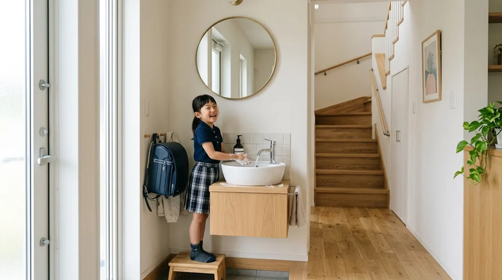 例えば、玄関ホールにコンパクトな手洗い器を設ければ、帰宅後すぐに手洗いうがいができ、ウイルスを生活空間に持ち込まない動線が完成します。また、2階の廊下にセカンド洗面台を設ければ、朝起きてすぐに2階で顔を洗ったり、寝る前の歯磨きを済ませたりすることができ、朝の1階洗面所の混雑緩和に大きく貢献します。