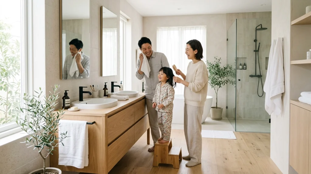 家族の生活リズムが重なる朝、家の中で最も混雑し、動線が交差する場所が「洗面所」です。夫がヒゲを剃り、妻がメイクやスキンケアをし、子どもたちが寝癖を直して歯を磨く。これらが限られた時間帯に一極集中することで、「早くして!」「ちょっとどいて!」といった言葉が飛び交う「朝の洗面所渋滞」が発生します。