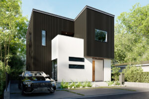 AIMORYの外観は、スクエアなフォルムとモノトーンでまとめられたスタイリッシュさが特徴です。 「家事は大変なもの」という認識を変えるためには、まず家に帰ってきた瞬間に「ああ、やっぱり我が家は格好いいな」と思える心の満足感が欠かせません。ブラックのスリット窓やコントラストの効いた外観デザインは、都会的で洗練された印象を与え、住む人のモチベーションを高めてくれます。