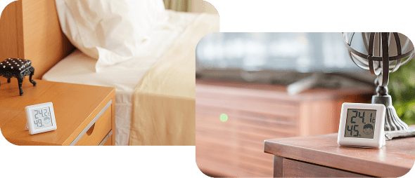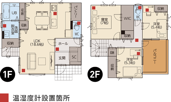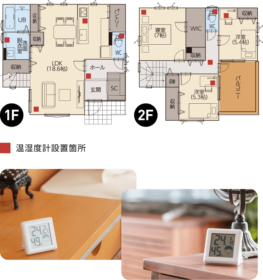一般的な全館空調の住宅では、湿度の差までは調整できていない場合がほとんど。「ブローボックス」は湿度も全館均一にすることで、本当の意味での「全館空調」を実現しました。イシカワでは、住宅の至るところに温湿度計を設置し、均一な温度・湿度を実証します。