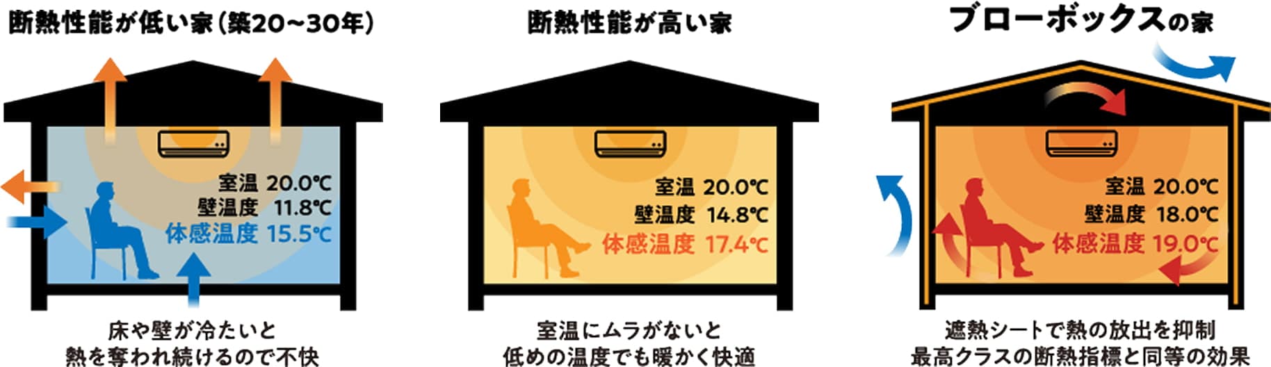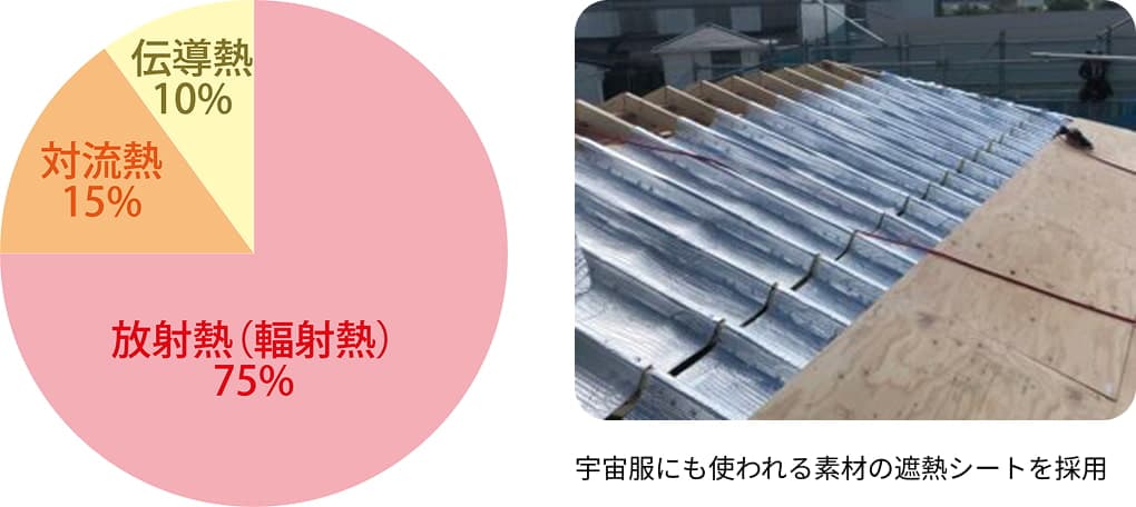 快適性をつくるのは、実際の室温ではなく体感温度。その体感温度を守るため、外気温と輻射熱をブロック。宇宙服にも使われる「遮熱シート」を屋根と壁内部に取り付けて、外気に影響されない温熱空間を生み出しています。