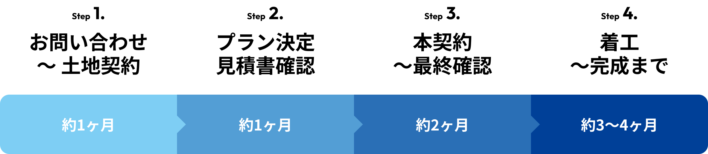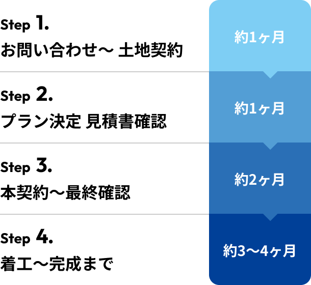 ※ 天候、立地条件、建物規模、設計・仕様の追加・変更、その他諸条件により、工期が変更になります。