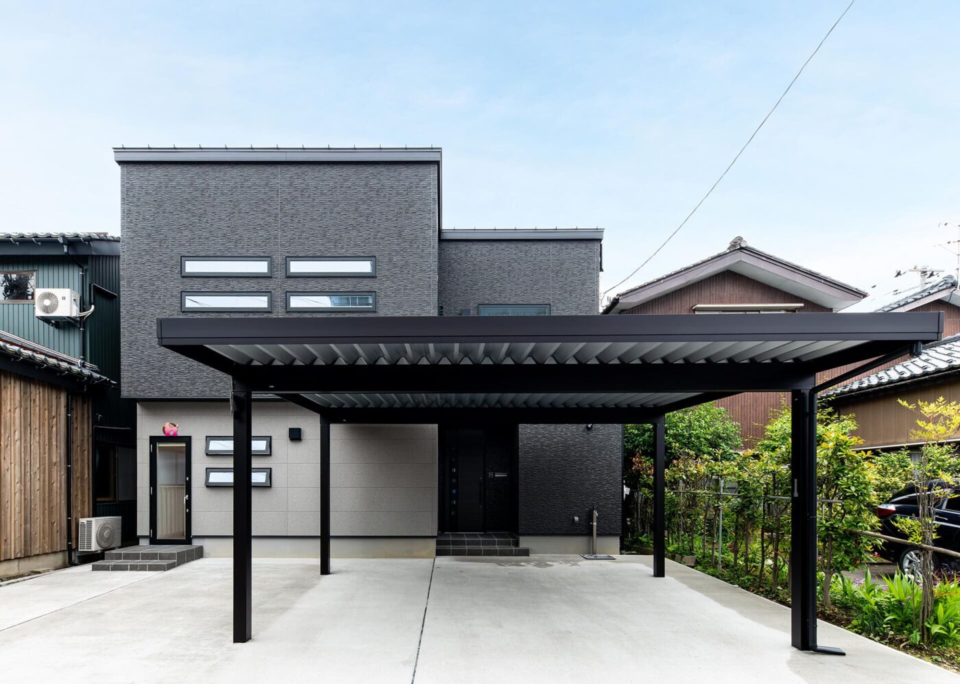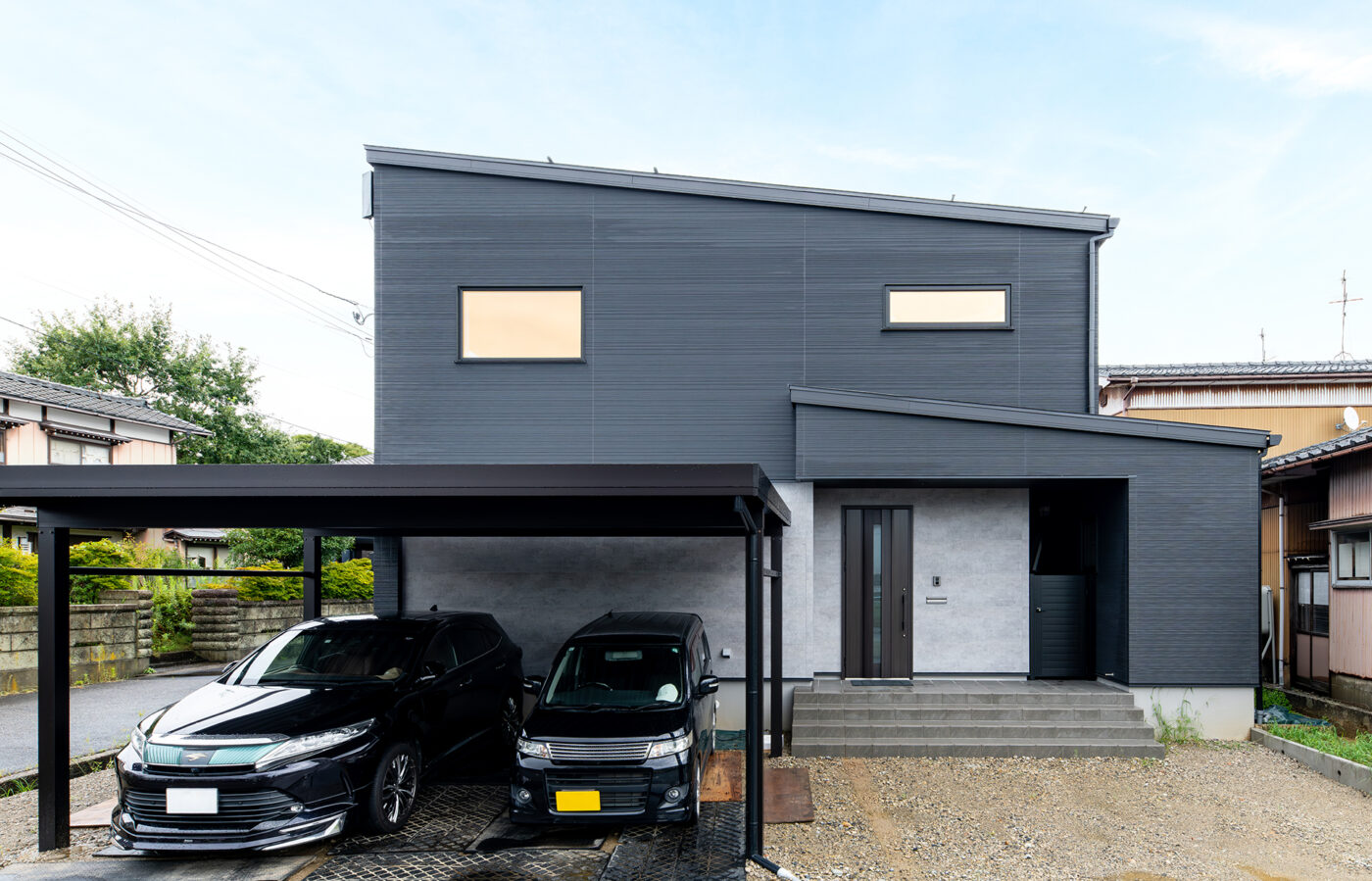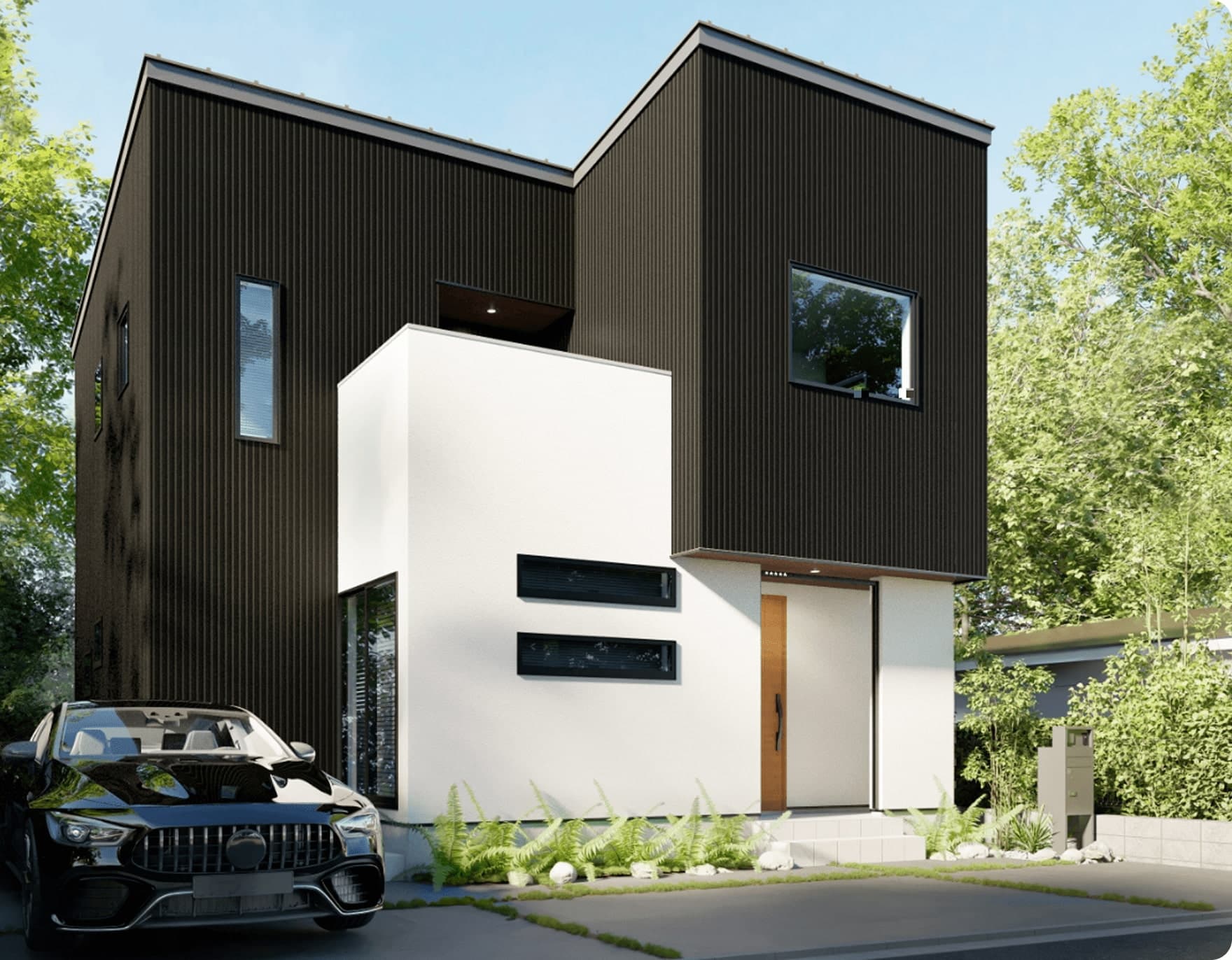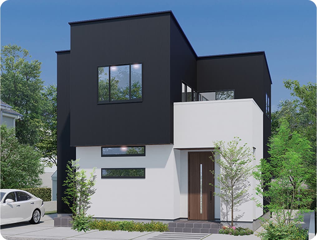 「アイモリー」は、個性が際立つモダンデザインな住宅で、ボックスを重ねたスクエアなフォルムが特徴です。ブラックカラーのスクエア窓やスリット窓の配置が外観のアクセントとなってスタイリッシュな印象に仕上がりました。