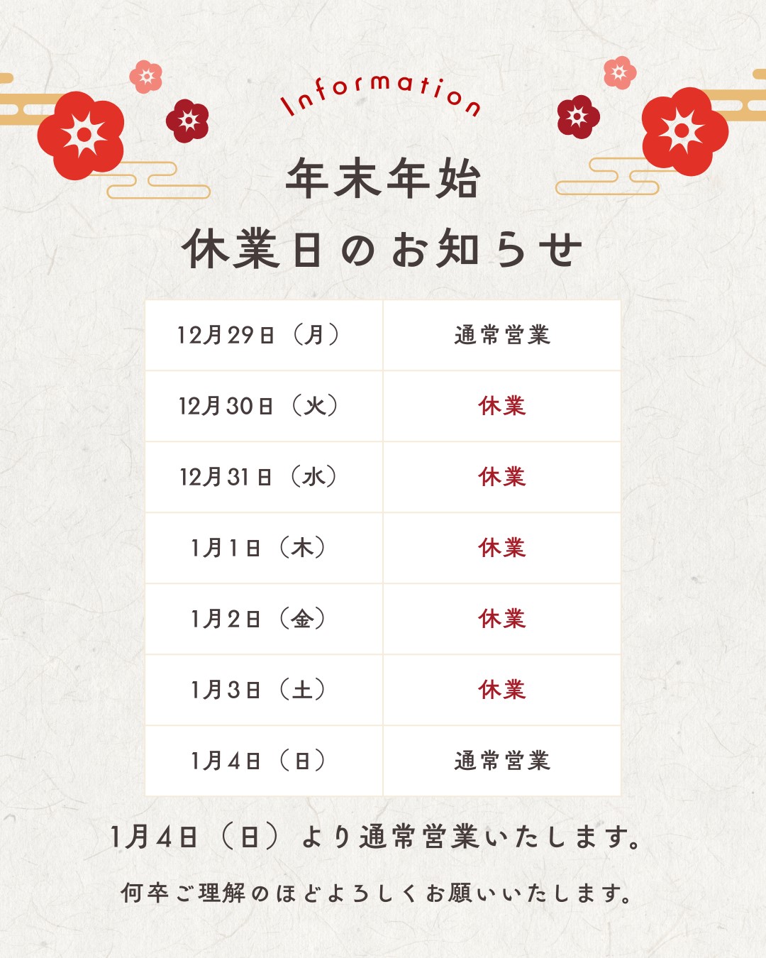 誠に恐れ入りますが、12月30日~1月3日を休業とさせていただきます。