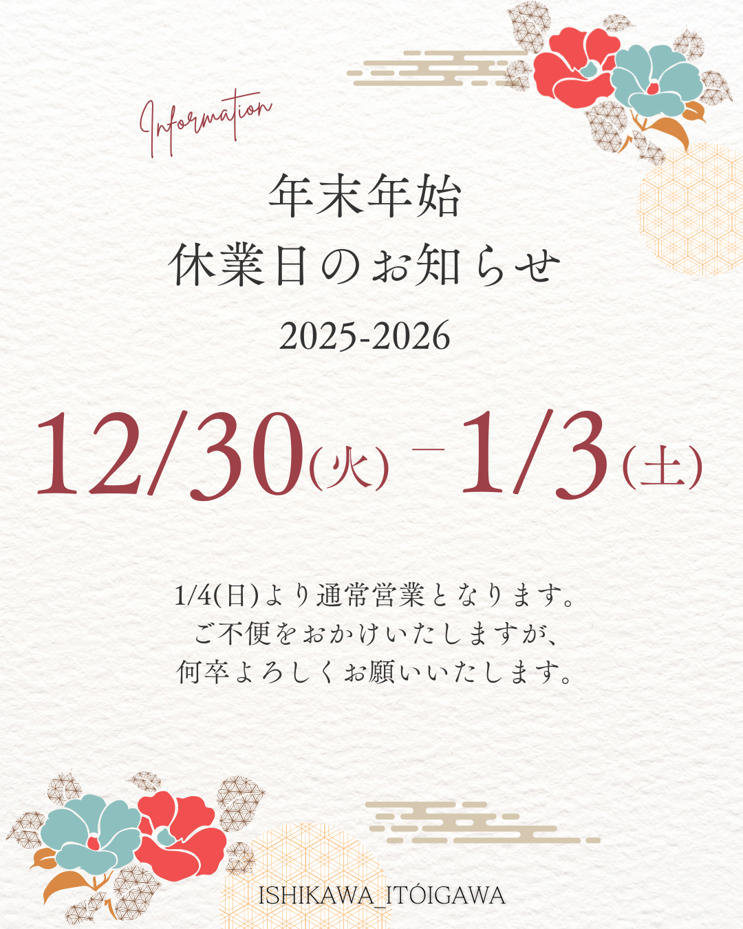 年末年始休業日のご案内