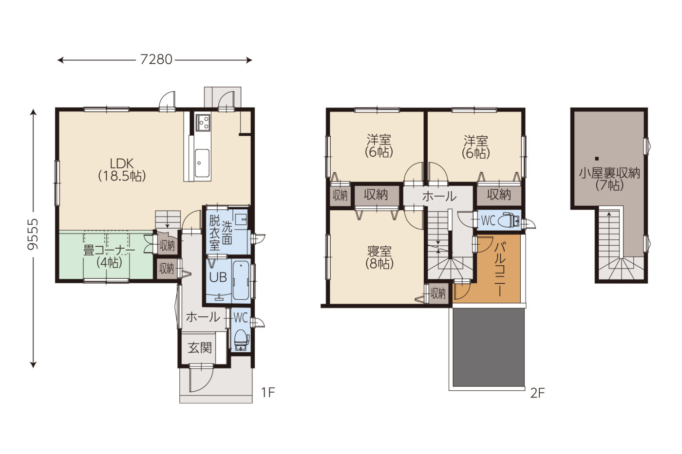 1階に子育て世帯に人気の畳コーナーと各所に収納スペースを設置して使いやすいシンプルハウス。収納力の高い固定式階段の小屋裏収納や、外でのお洗濯や子供の遊び場としてうれしいバルコニー。