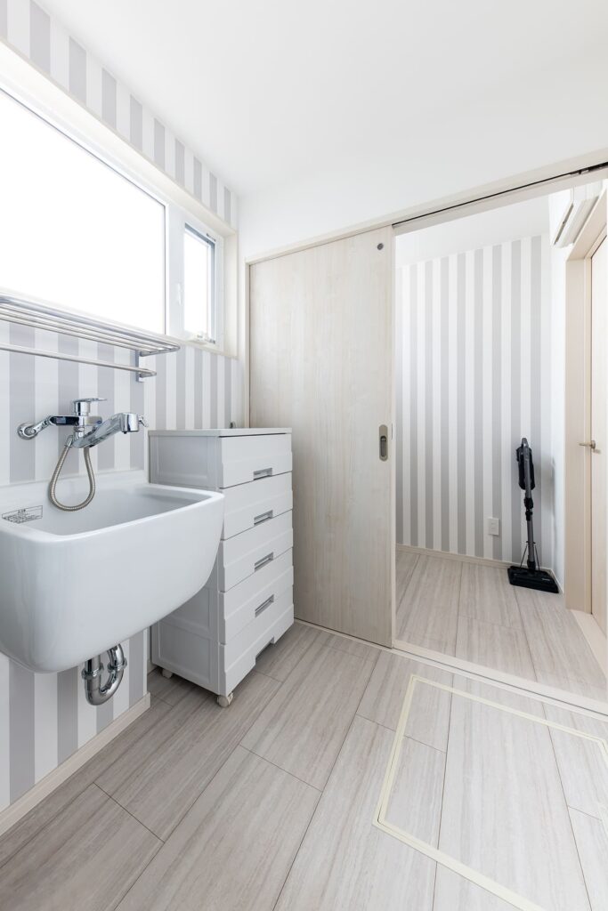 奥は独立した洗面スペースで、玄関ホールからも入れる便利な設計。