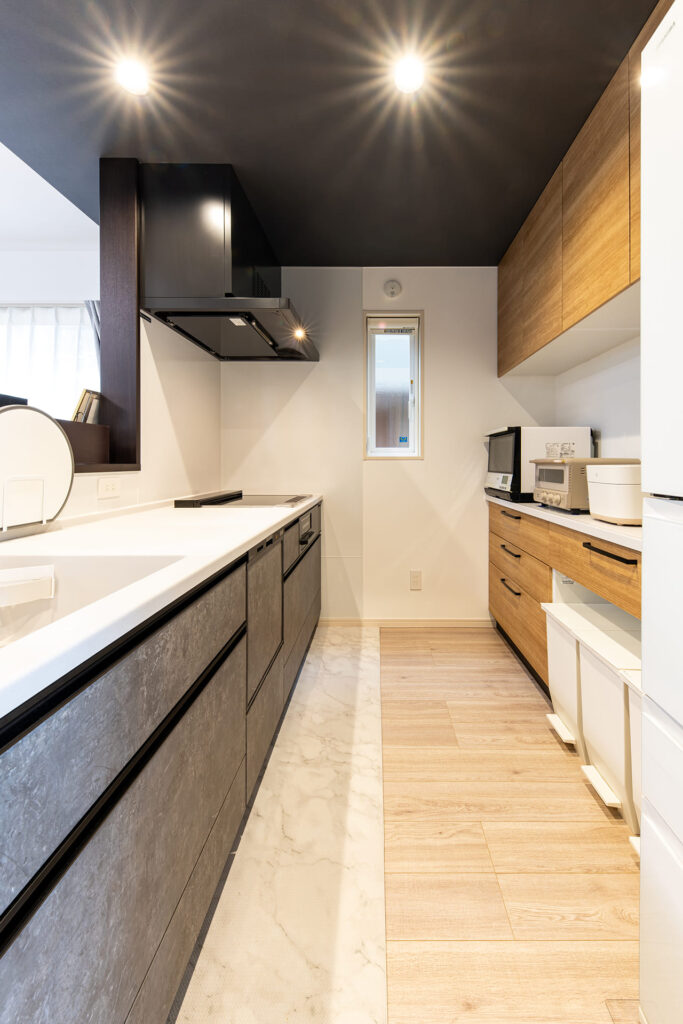 吊り棚とカップボードは木目調を選びやわらかい表情をプラス。