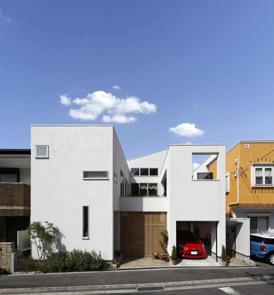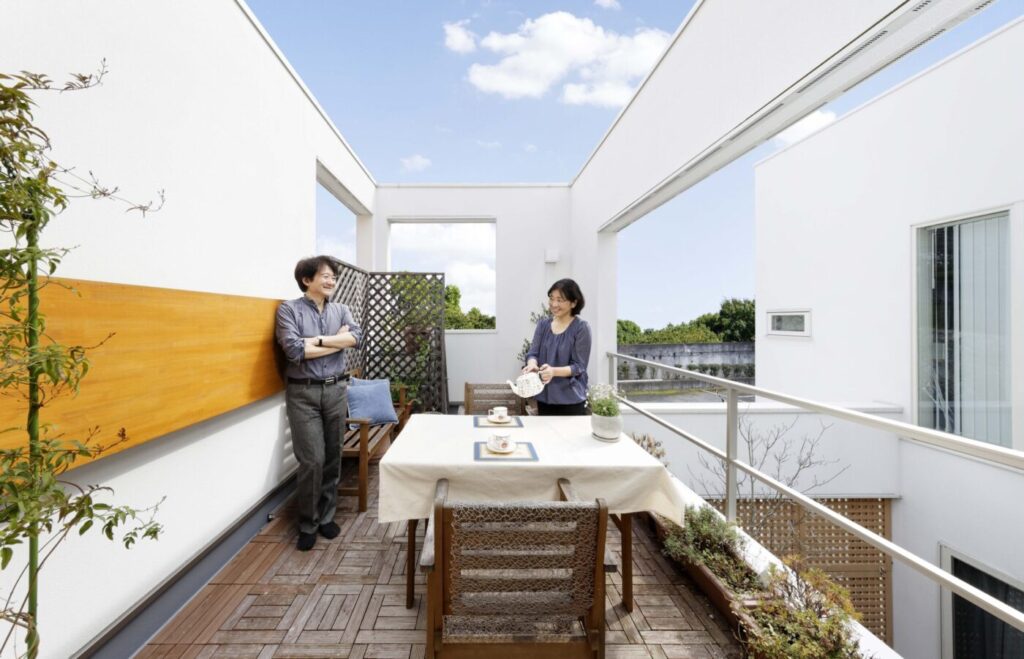 完全分離の二世帯住宅のバルコニーは1階の親世帯と視線を交わし合える配置に。