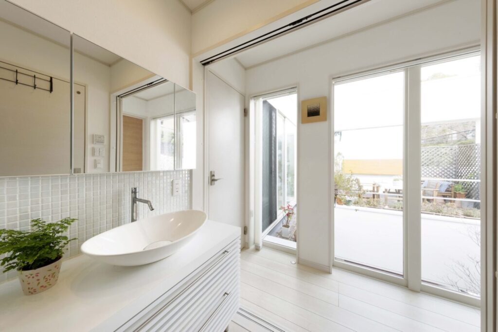 中庭の先には桜並木があり、満開の春や新緑の初夏には、サニタリールームからの眺めが暮らしを彩る。