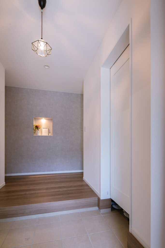 右はシューズクローク、左にはガレージにつながるドアが配置されている。