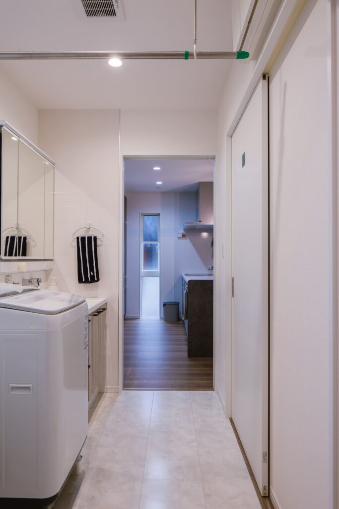 洗面室にはハンガーバーを設置して室内干しにも対応。