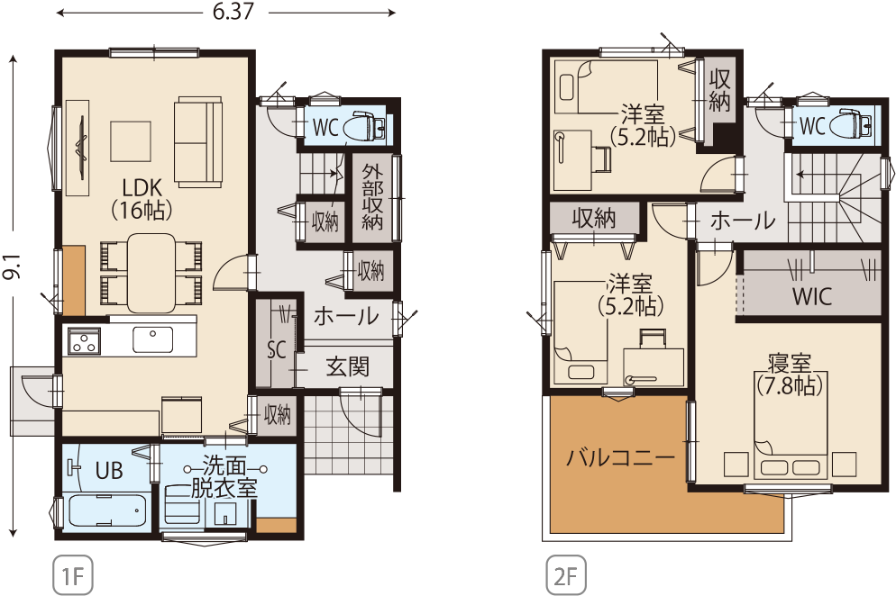 人気のボックスタイプの外観が目を引くシンプルな住宅。シューズクロークや洗面脱衣室の収納など、使い勝手の良い収納がたくさんあります。最大の特徴は大きなバルコニー。バーベキューなど人目を気にせず楽しむことができます。