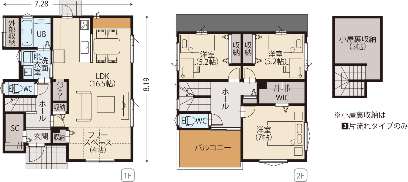 4帖分のフリースペースがあり、LDKと合わせると20帖以上の大空間となります。畳を敷いて畳コーナーとしても良いですし、そのまま広いLDKとして広く使う事もできます。また洗面脱衣室はホールとLDKの両方向からアクセスができる機能的なプランとなっており、いわゆる回遊動線として便利にお使いいただけます。