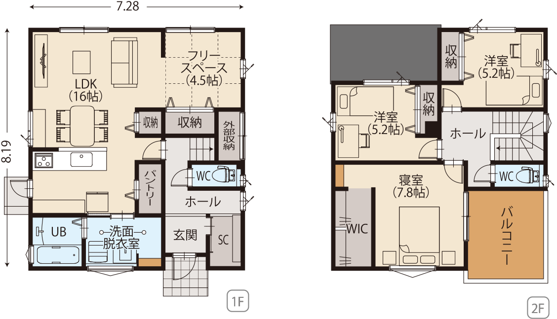 ダイニング、リビング周りには収納がたっぷりあり、シューズクロークは玄関からホールまで通り抜けての利用が可能です。外部収納もあり、アウトドアグッズやタイヤなど収納して頂けます。脱衣室も広めになっており、収納にしたり室内干しスペースにするなど、使用方法は様々です。広いバルコニーにはテーブルやいすを置くこともでき、家族でのんびり過ごせます。