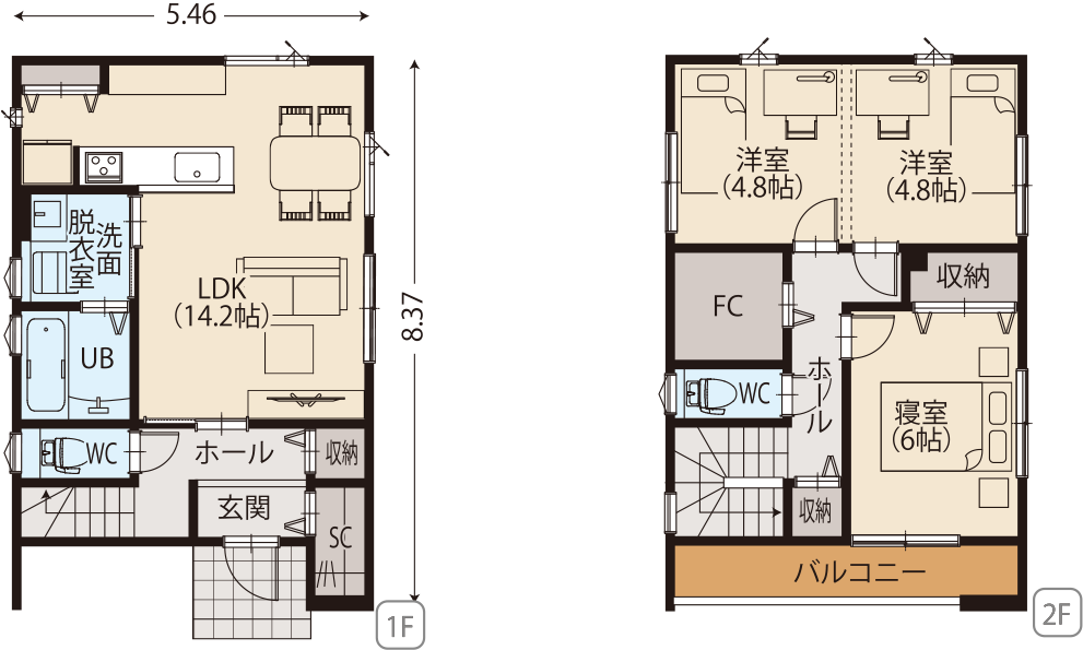 将来子供の成長に合わせて1つの部屋を2つに分けられる4人家族にピッタリなプランです。また、窓がないホールでも階段に窓を取り付けることにより明るさを保つことが出来ます。外観は白を基調にバルコニーや軒天を黒にすることでシンプルかつシックな外観になっています