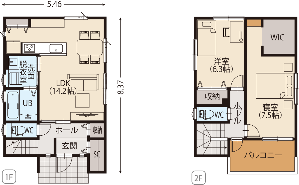 大きなバルコニーは子供の遊び場やイスとテーブルを置いてくつろぐなど自分に合った使い方が出来ます。また、主寝室にあるカウンターはパソコンを置いて書斎スペースにするのもよし、お化粧をするドレッサーにするのもよしと使い勝手抜群です。外観は軒天をウッド調にすることによりナチュラルでおしゃれになり、周りの家との差がつくこと間違いないでしょう。