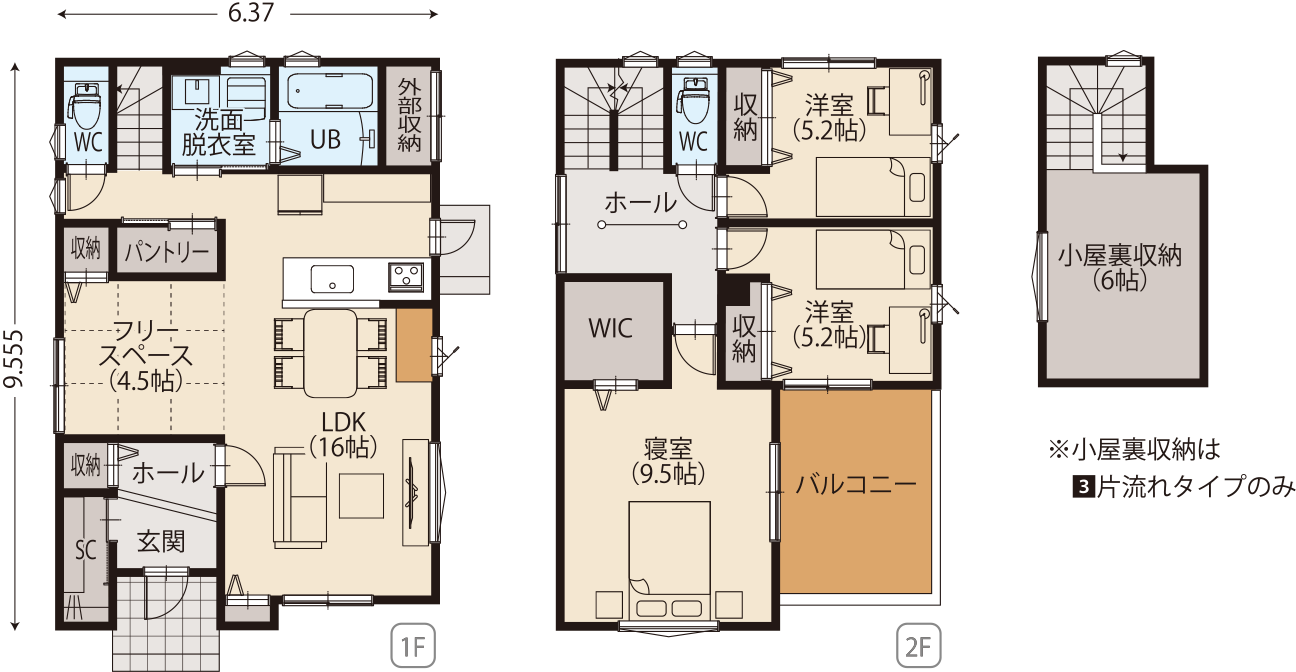 リビングを通り抜けてからの階段で、家族が自然とリビングで顔を合わせます。広いリビングとしても、フリースペースを間仕切って、畳スペースや個室としての利用もできます。片流れの屋根にすれば小屋裏収納を作ることも可能です。