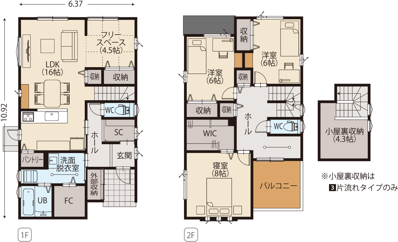 ファミリークロークが洗面脱衣室に隣接しているので物干→片付けの流れがスムーズです。ファミリークロークに加え寝室には広々WIC、屋根形状によっては小屋裏収納をつけることができるので、収納たっぷりで季節ものが増えても安心です。玄関ポーチに隣接した位置に外部収納もあるので、タイヤや除雪グッズの置き場にも困りません。