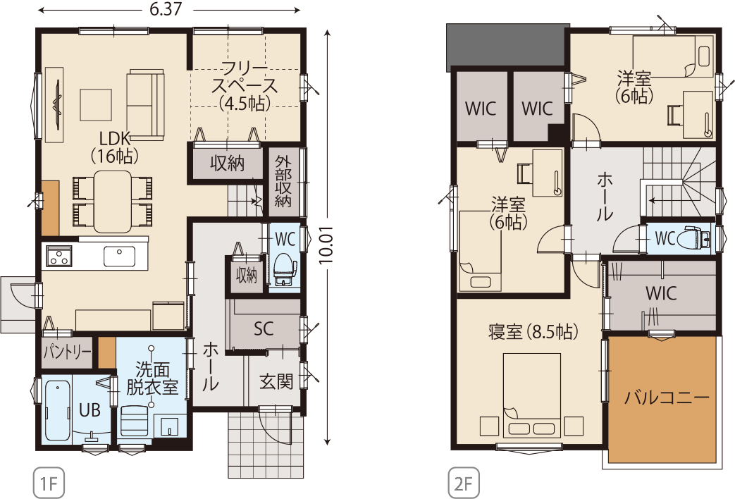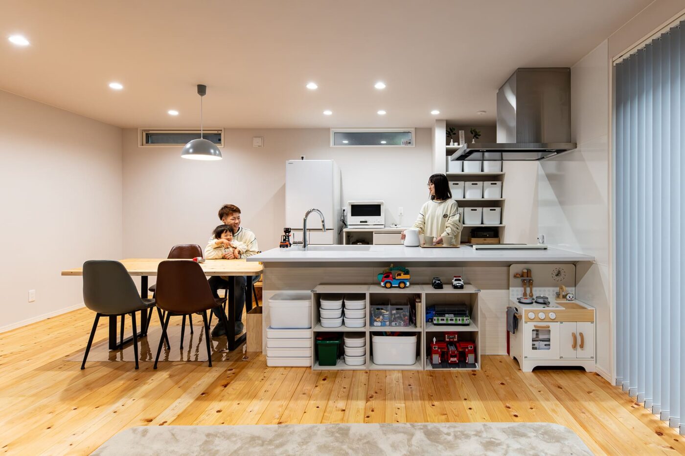 各室にWICがあるので季節ものの管理がしやすいです。外部収納にはタイヤや除雪グッズなどを置いておけるので、オフシーズンの際の置き場には困りません。LDKに隣接したフリースペースは区切って使用することもできるので使い方の幅が広がります。