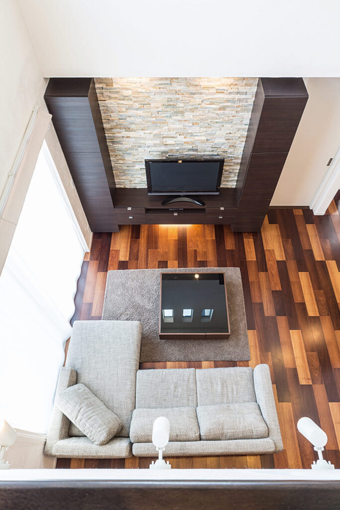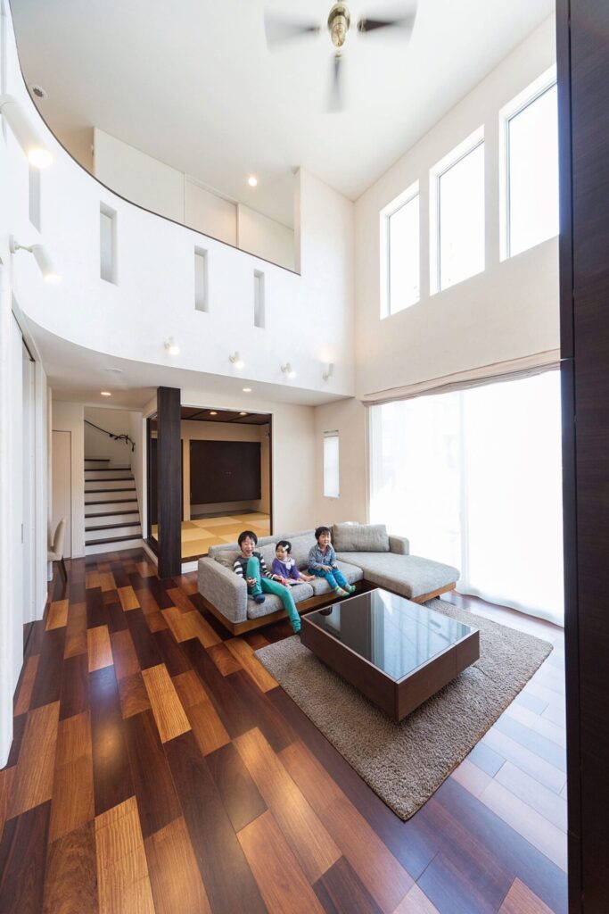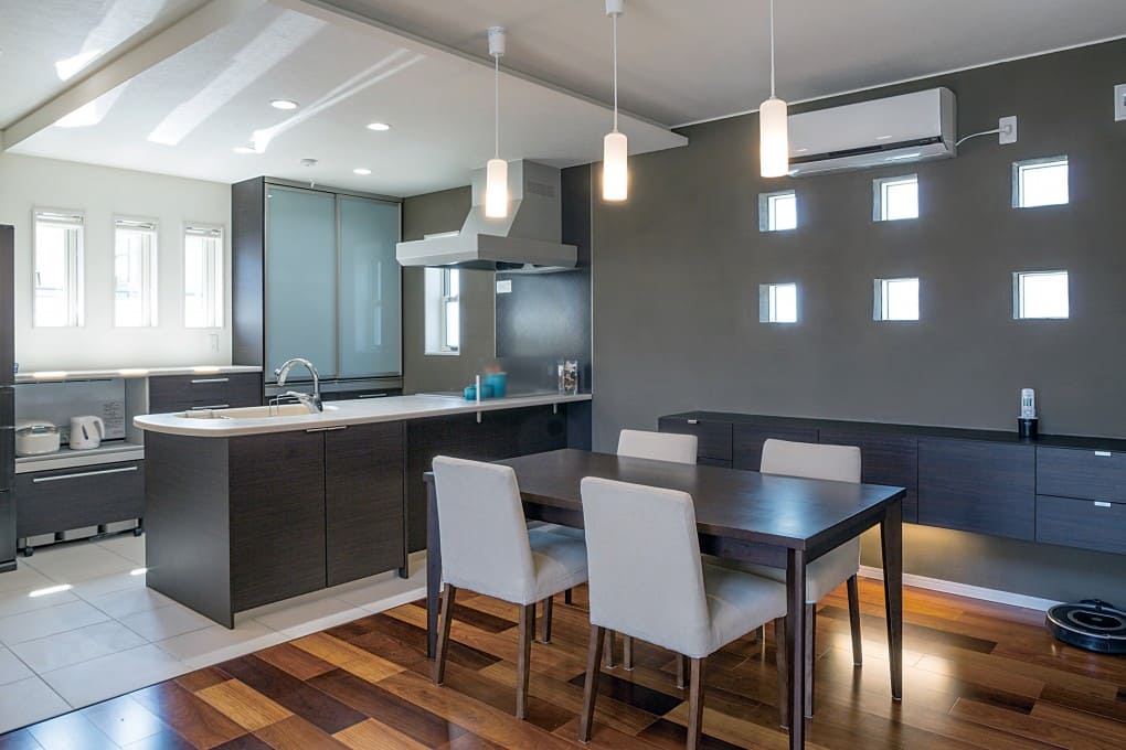 日差しを取り込む十分な数の窓を設けながら、リビングは大型液晶TVを置くことを想定して壁を残し、横スリットの窓にする細かな配慮も。